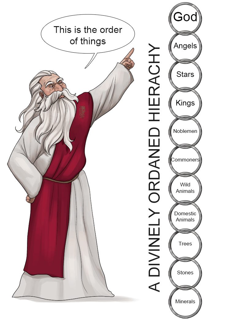 The Chain of Being, as depicted in the play is a hierarchal structure where God is at the top, followed by angels, humans, animals and inanimate objects each with a designated place. Disobeying the monarch or disrupting this order was seen as a sin, challenging God's authority.