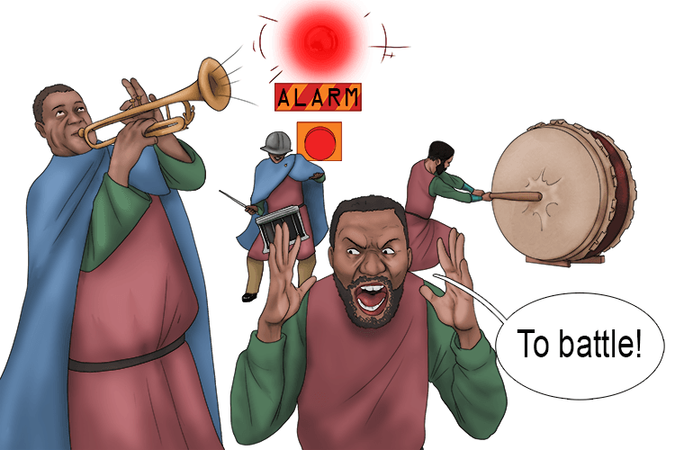 The alarm went and men started beating drums (alarum) and trumpets and other men were shouting, "To battle."